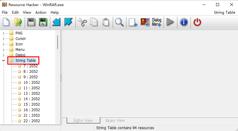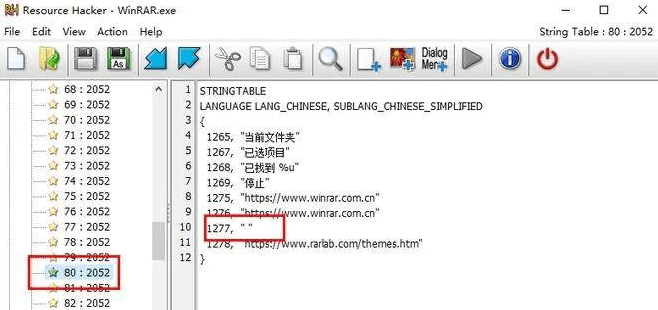 7、.在左侧栏中依次选择 “String Table” “80 : 2052”,删除1277行引号内的内容,用空格代替。